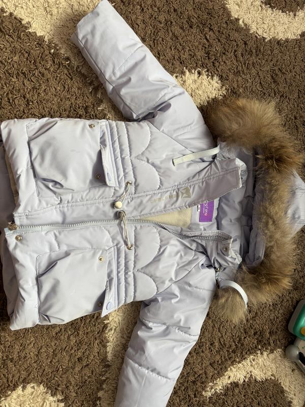 Курточка дуже тепла не збита, на дівчинку Є пятнишка, можна вистірати Трішки розторочилася( не порвана)