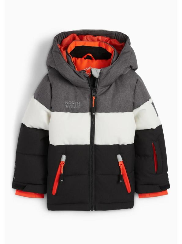 Утеплена, вітронепроникна і водонепроникна лижна куртка з тканої тканини, що дихає, в кольоровому блочному дизайні. Капюшон, світловідбиваючі деталі, а також кишені на блискавці з боків та на рукаві. Регульований ремінь на липучці та внутрішній рукав манжет з отвором для великого пальця. Рукав від плечика 48 см Рукав від шийки 55 см По грудей 43 см Довжина 58 см . Розмір : 128