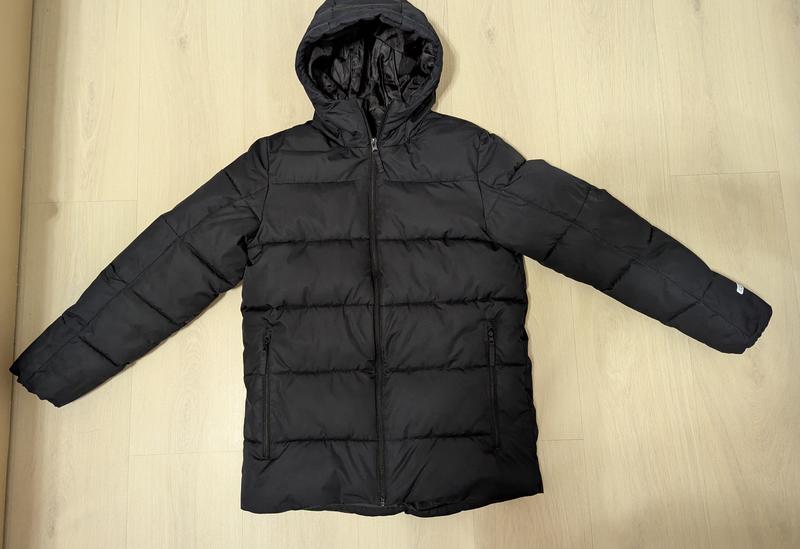 Замеры и состав на фото. Теплая,на холлофайбери. Без потертостей, фурнитура в норме. Капюшон не отстегивается. Внизу куртки есть фиксаторы для защиты от ветра. Карманы на молниях. Темного черного цвета. Сзади и на рукаве светоотражающий элемент. Оригинальный.