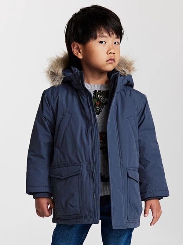 Парка з водовідштовхувальної функціональної тканини з пухнастим відстібним капюшоном та коміром-стійкою на флісовій підкладці. Застібається на блискавку спереду з захистом підборіддя від натирання, має вітрозахисний клапан із прихованою застібкою на липучку, передні кишені з клапанами та застібкою на липучку, а також діагональні нагрудні кишені. Ребриста відрізна частина манжет. На підкладці.