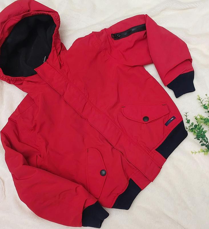 Красная утепленная детская куртка с капюшоном, черной подкладкой, диагональной молнией и карманами на кнопках. Теплая и удобная. Капишон не снимается.