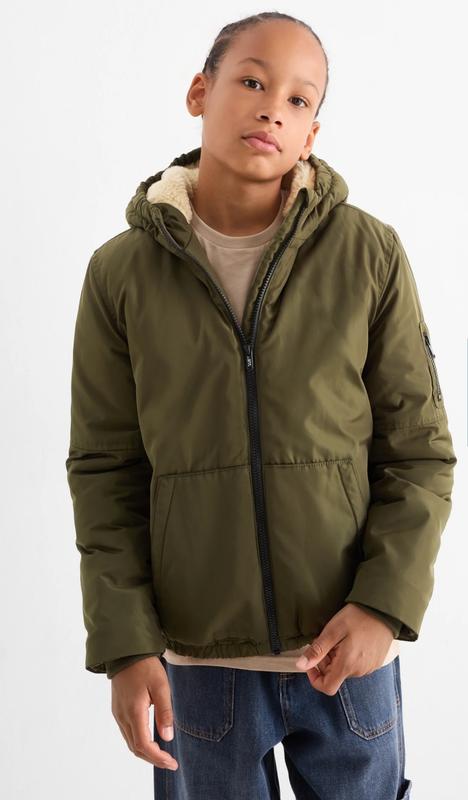 Легко утепленная куртка-бомбер из гладкой тканой ткани. Капюшон с подкладкой тедди, разделительный карман-кенгуру и карман на рукаве на молнии. Ребристые манжеты с внутренней стороны рукавов, эластичный подол и тонкая подкладка с карманом на липучке. Капюшон не смывается. Размер 14+. Замеры: ширина плечи 42, рукав от плеча по манжет 65, под рукавами 55, пояс на резинке 48, длина 66. .