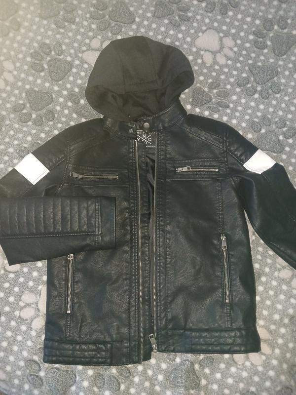 Черная кожаная куртка C&A. В новом состоянии.Размер 152 Материал: Искусственная кожа (экокожа). Стиль: Байкерская куртка (косуха). Особенности дизайна: Стеганые вставки ("ребиста" текстура) на плечах и предплечьях. Контрастные белые горизонтальные полосы на верхней части рукавов. Съемный капюшон, который крепится на пуговицах. Два нагрудных кармана на молниях и два боковых кармана для рук.