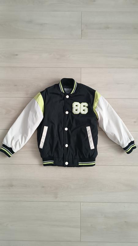 Стильна куртка -бомпер ,утеплена на підкладці.Є кармани.Розмір вказаний 3-4 роки.104см.Довжина 44см.ПОГ 38см.Рукав від плеча 36см.від шиї 46см.Орієнтуйтесь по замірах.