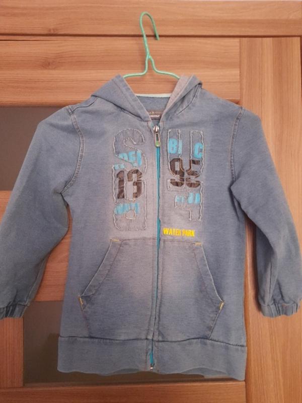 Куртка джинсовая фирмы ORCHESTRA, тоненькая, голубого цвета, на замке, с карманами и капюшоном, с нашивки спереди и небольшим принцем зади. На левом кармане едва заметная небольшая пятнышка. Длина 52 см Ширина 35 см Длина рукава 40 см.