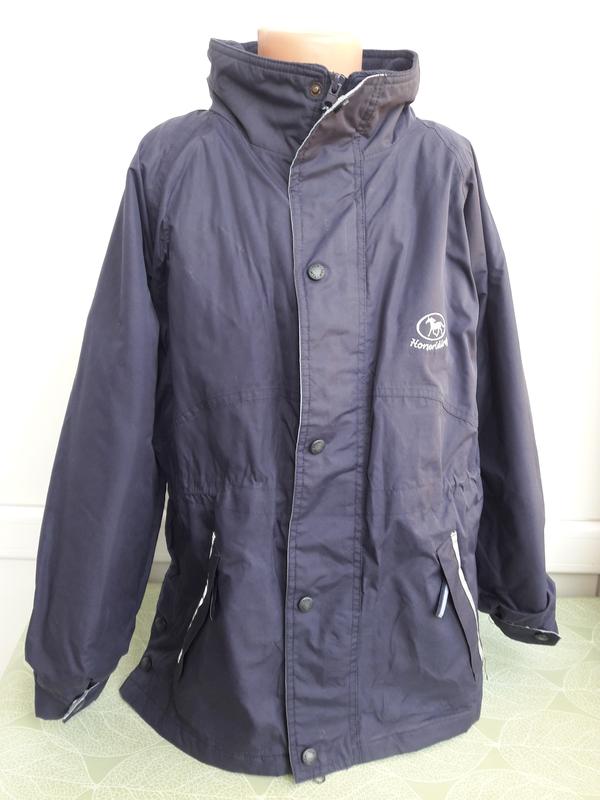 Куртка, весна, осень для мальчика, темно синего цвета, впереди на молнии молнии и кнопках по толии кулиска внутри по боковым швам розрез и на кнопках, капюшон тонкий собирается в воротник, 2 кармана на молнии, рукава на резинке и на кнопке, подклад стеганый. Длина изделия 64 см, полуобхват груди 50 см, длина рукава реглан 63 см.