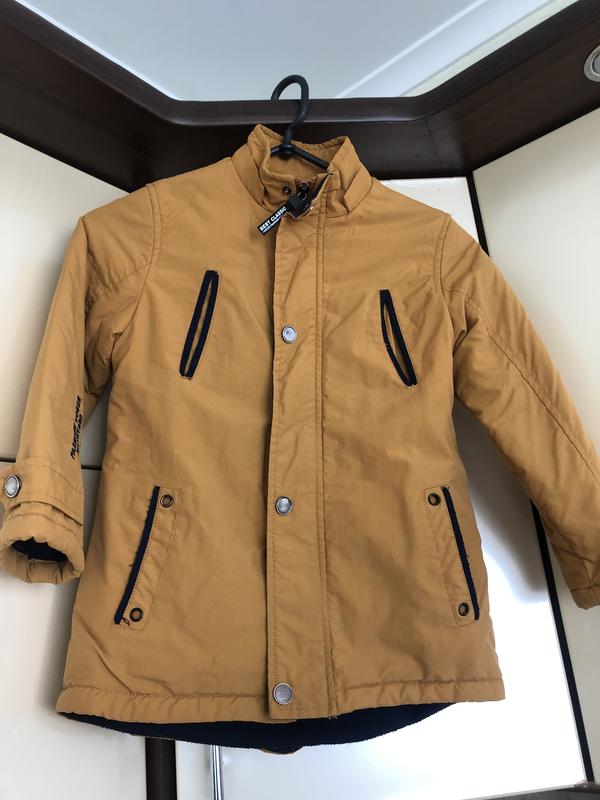 Куртка для хлопчика жовтого кольору на ріст 122см. Матеріал плащовка на флісовій підкладці. Стан ідеальний. Ніяких пошкоджень немає. Замок і заклепки працюють..