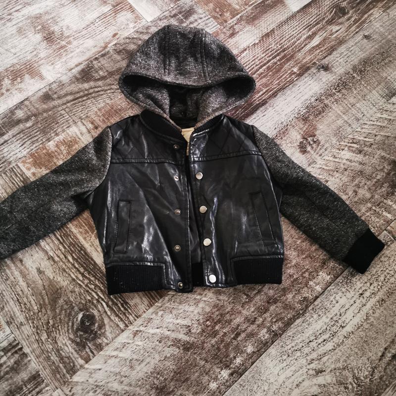кожанная куртка с трикотажными рукавами и съемным капюшономна кнопках