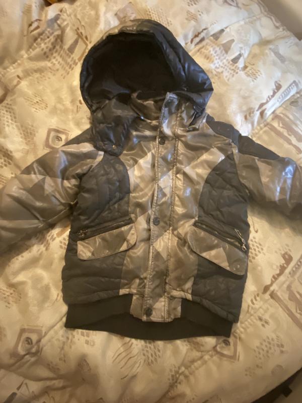 Якісна Тепла Не мурка Холлофайбер / фліс Подвійна блискавка, кнопки - все робоче Резинки не розтягнуті Кармани Капюшон зйомний Є нюанс на фото (біля капюшону потребує підклейки 0,5 см - далі не йде) На 5-6 років Рукав 29-30 По спині 56
