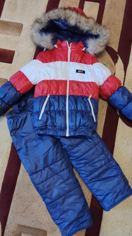 зимовий костюм. Довжина куртки 45, рукав 38, плечі 30. Довжина штанів 63, крок 41. На куртці є невелика дирка( на фото видно)