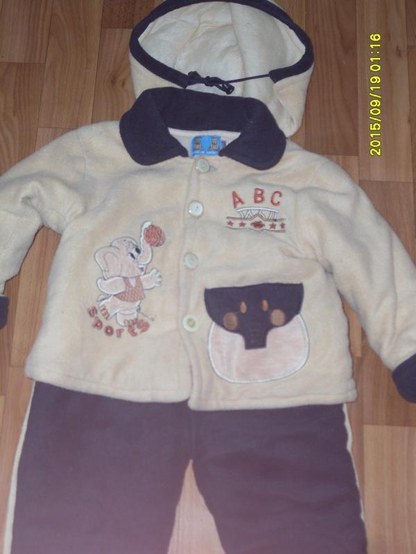 Тепленький флисовый костюмчик на синтепоне на 2 года.Есть капюшон.Очень мягенький и практичный.Длинна курточки 37 см ,длинна рукава 30 см,длинна штанишек 48 см.