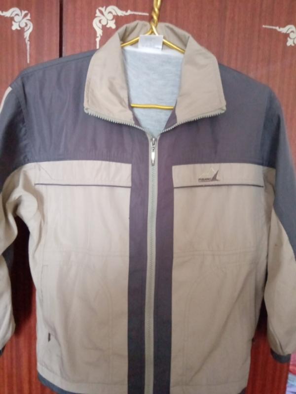 дитяча куртка з плащової тканини з підкладкою, розмір L; спинка ззаду-50см; від плеча до плеча -47см, довжина=61см; рукав з гумкою=44см; є плямочка від клею.