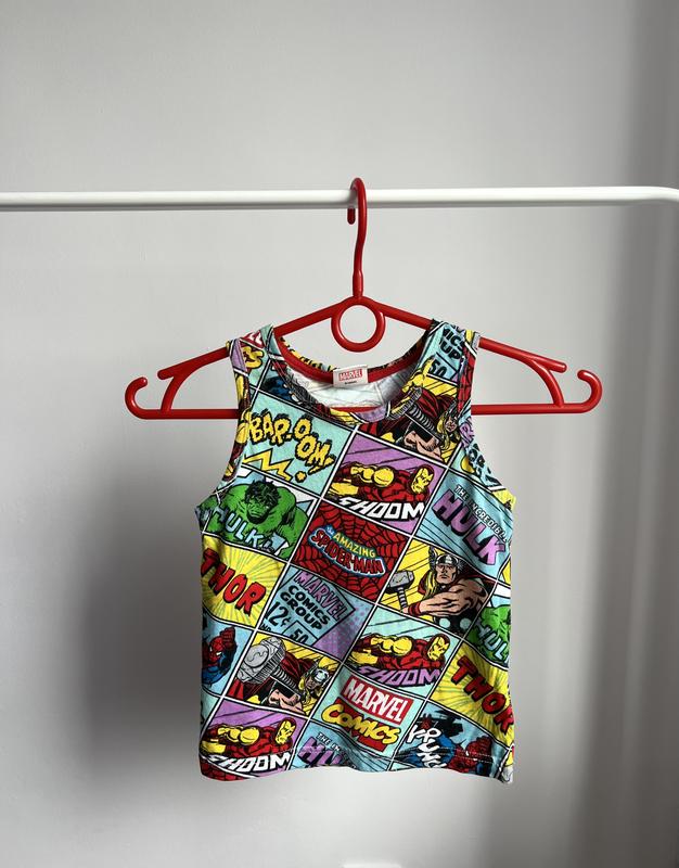 Стильная майка с ярким принтом marvel comics Натуральная ткань, приятная к телу Состояние идеал как новое Замеры Длина-37 П.о.г-29 Плечи-21,5