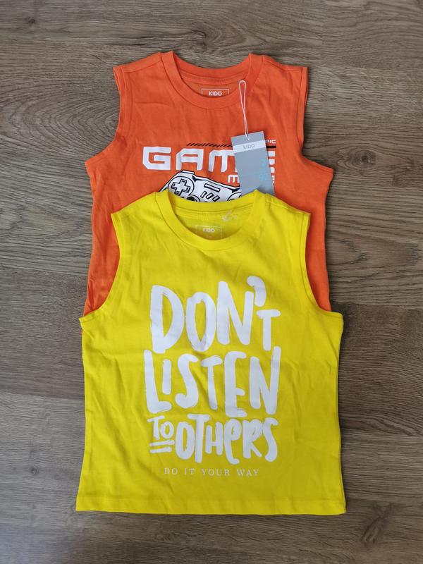 Новые маечки на мальчика. Размер 2, и 3-4. Замеры размера 2, желтая длина 41см., в груди 33,5см., в плечах 26см. Оранжевая длина 40см., в груди 34см., в плечах 27см. Голубая длинна 41см., в груди 34см., в плечах 26см. Размер 3-4 оранжевая длина 42,5см., в груди 36см., в плечах 29,5см. Голубая длинна 44см., в груди 34см., в плечах 26,5см. Жёлтая длинна 43см., в груди 35,5см., в плечах 28см.