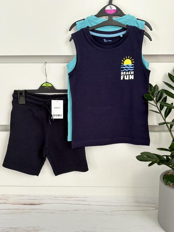 Літні майки, футболки без рукавів для хлопчика британського бренду TU р.104-110. В двох кольорах: блакитний та темно синій. Чудової якості, 100% бавовна. Гарно підійдуть для спекотних літніх днів. Ціна однієї 180 грн.