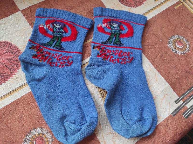 Носки синего цвета с красным рисунком, размер 17-22. Длина в стопе 17-22, высота 11-13 см. Стан великолепен! Есть чуточку катышки.