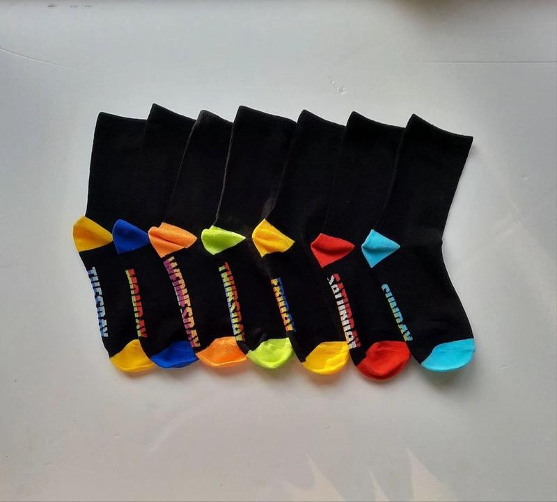 PRIMARK оригинал Англия Трикотажные черные носки с разноцветным принтом "Дни недели" 7 пар в упаковке Размеры: 3-6 лет (27-30 евр), 7-10 лет (31-36 евр), 11+ (37-40 евр) Коттон микс Носки не маломерят. Берите тот размер, который носит ребенок