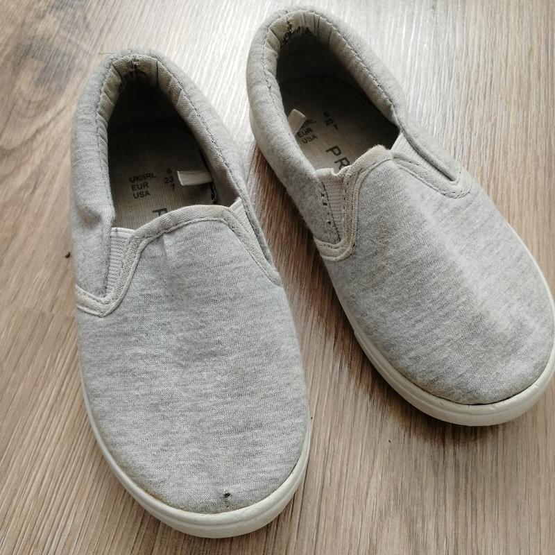 Мокасины серого цвета, тряпошные, подошва - резина. Размер 23. На фото видно состояние - проступила немного желтизна от стирки, при желаниии можно отстирать. Так же есть небольшие дырочки - на носке правого мокасина и на пятках обоих