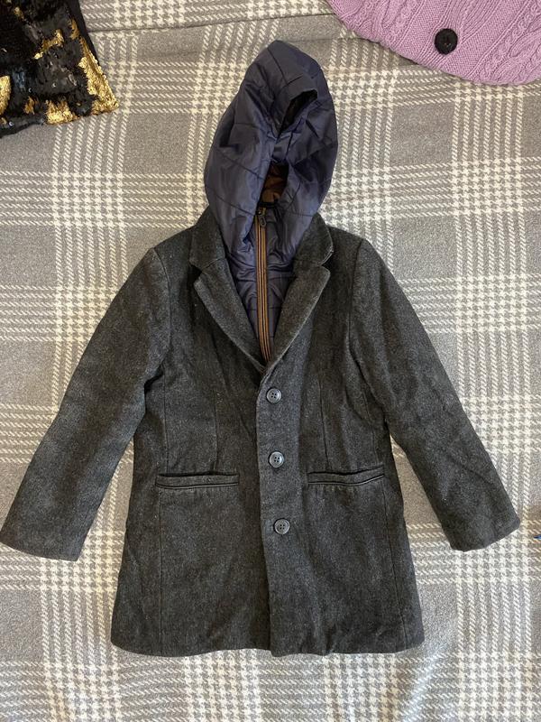 Стильный пиджак пальто с капюшоном, который вместе с синей вставкой снимается, можно носить отдельно пальто.