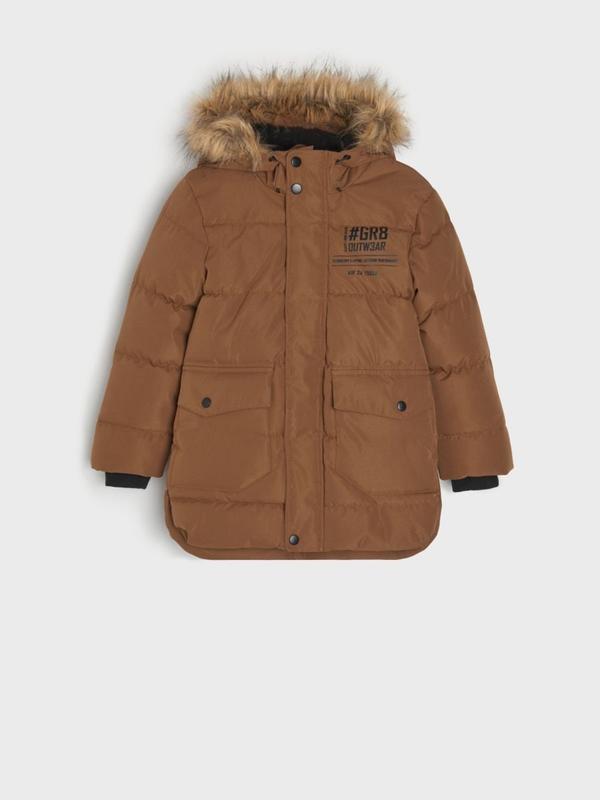 капюшон с искусственным мехом застежка-молния и кнопки два кармана рукава с оформленными резинкой манжетами декоративный принт флисовая подкладка
