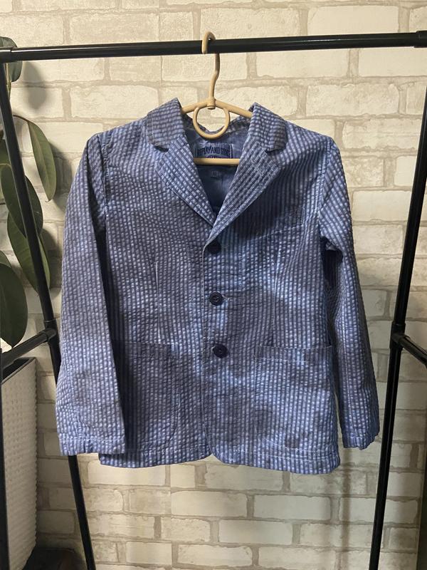 Очень крутящий пиджак, классно смотрится под джинсы и брюки, легкий. Без подкладки, карманы спереди и с уда функциональные. Без дефектов. Примерно идет на 4-6 лет, лучше ориентируйтесь на замеры. Длина по спинке 45,5 см; плечи 30 см, ПОГ 36 см.