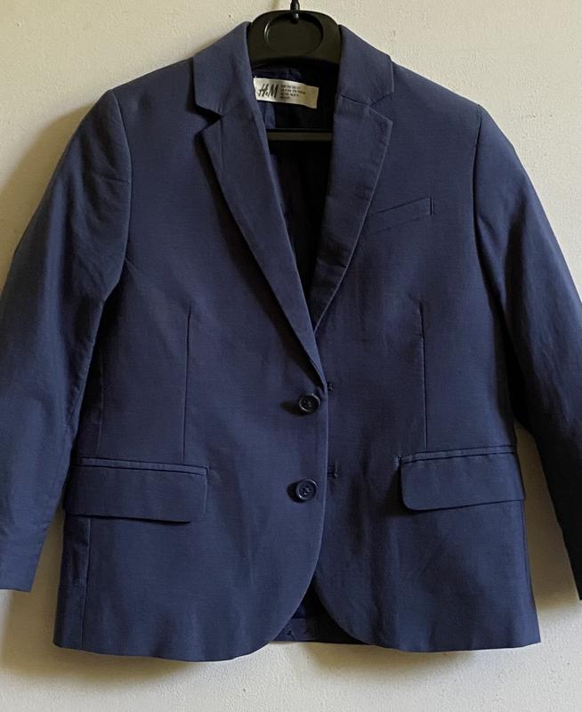 Класичний піджак для хлопчика. 4-5 років на зріст 110см. На підкладці. Застібка- 2 ґудзика. 110% поліестер. Заміри: Довжина 46см Довжина рукава 37см Ширина по лінії груді 34см.