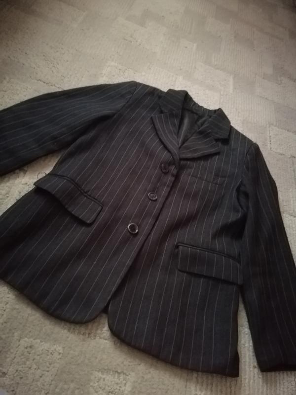 Пиджак школьный на 8-9-10р Состояние хорошее, только подкладка в затяжки. серо-черного цвета в серую полоску. Смотрите замеры Длина от плеча 57, рукав от ворота 60. Пог 44.