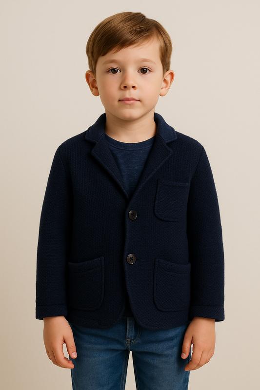 Піджак на хлопчика 6 років (116 см). Темно-синій, із щільної в’язаної бавовняної тканини. Має три кишені, ґудзики спереду та контрастний комір. Усередині — м’яка віскозна підкладка. Ідеально підходить для весни або осені. Сидить вільно, розрахований на середню статуру. Заміри (для 116 см): • Довжина виробу: ~48 см • Ширина під руками: ~35–36 см • Довжина рукава: ~42 см
