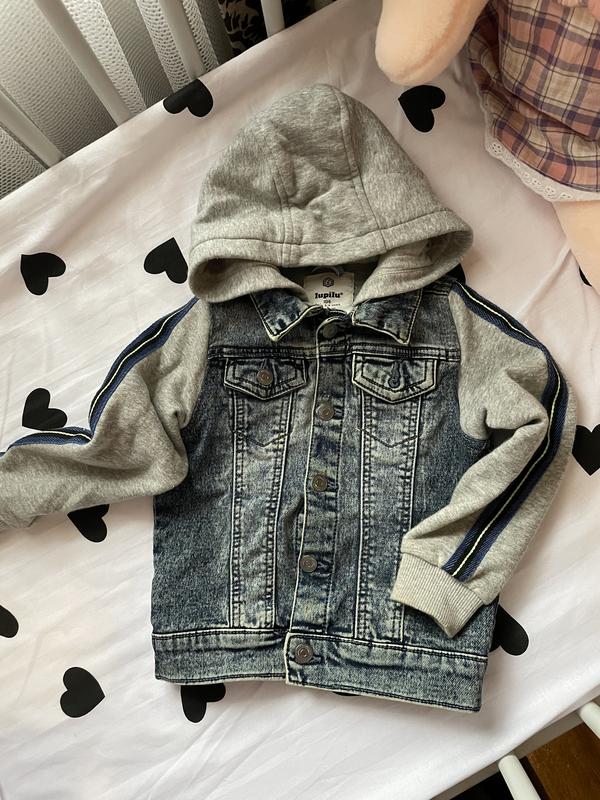 Дитяча джинсова куртка Lupilu з капюшоном. Стан: чудовий, без плям і пошкоджень. Стильна джинсівка— поєднання джинсової тканини та м’яких рукавів із капюшоном. Зручна для прогулянок у прохолодну погоду. Колір: синій джинс + сірий меланж. Застібка на кнопки, дві нагрудні кишені.