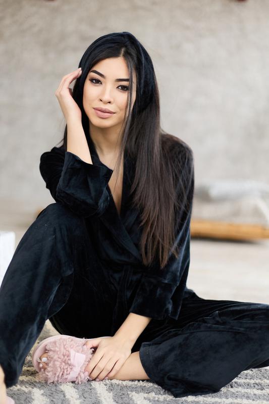 Мягкий домашний комплект выполнен из нежного материала плюш (велюр). В комплекте идут: укороченный халат, брюки, съёмный пояс. Рукав длинный, втачной. Вид воротника шаль.