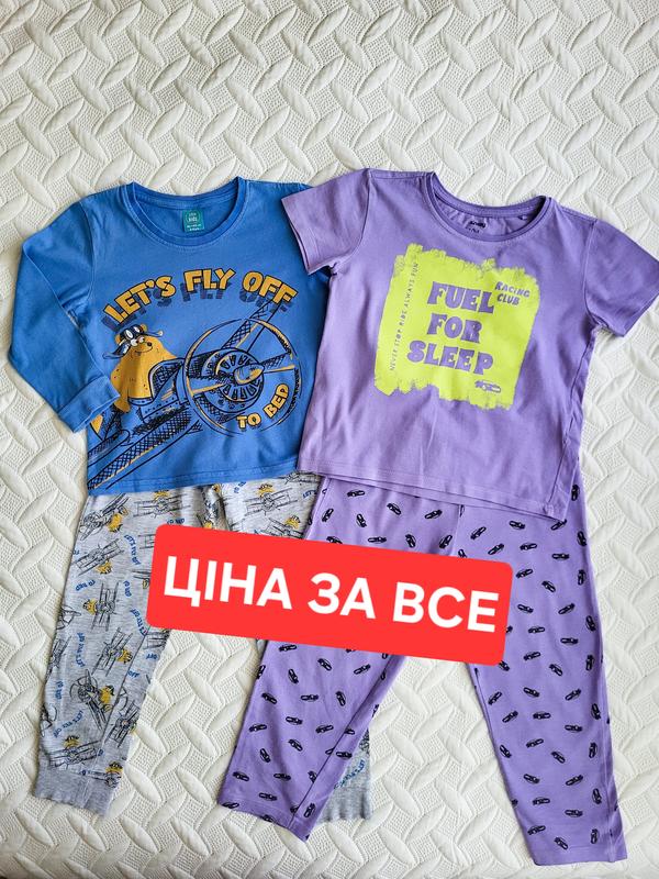 Детские коттоновые пижамки на мальчика Sinsay I Pepco р.98-104 в идеальном состоянии. Дефектов, нюансов нет. ЗАМІРИ Sinsay фиолетовая Плечи - 28см ПОГ- 34см Длина футболки - 38см ПОТ - 22см Длина брюк -57см Pepco синя Плечи -27см Рукав -31см ПОГ -33см Длина футболки -37см ПОТ- 23см Длина брюк -57см Есть олх-доставка
