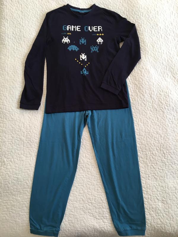 Котоновая пижама.Кофта синяя,штаны бирюзовые. Цвета яркие не выгоревшие. Без каких либо дефектов.Ширина плечей-39;ширина груди -44;Длина рукава-57см. Длина майки-62. Ширина штанов по резинке -34;длина штанов-85 На мальчика 12-14лет. В подарок белая утеплённая футболка