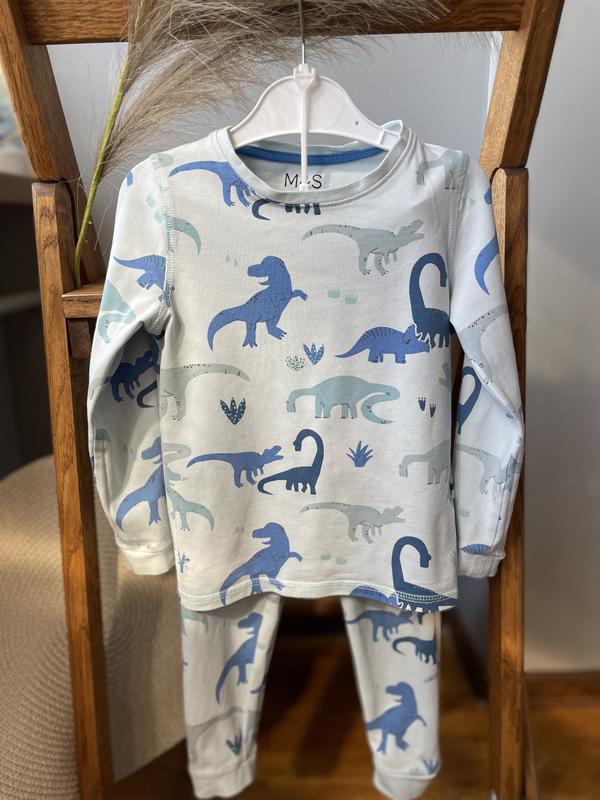Нежная голубая пижама с Дино принтом. Фирмы M&S по бирке 3-4 года (104 см). Замеры: верх- длина изделия 41 см, длина рукава 35 см; низ- длина изделия 57 см, пояс на резинке 23 см. Стан идеален, но на штанишках есть микро-пятна (незаметные).