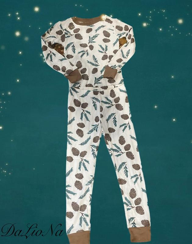 На фото зображений комплект одягу для сну, що складається з кофти з довгими рукавами та штанів, виконаний у молочному кольорі з коричневими манжетами та коміром. Одяг прикрашений візерунком із соснових шишок та гілочок. Тканина: органічна бавовна. Вік: 4 роки. Заміри кофти: - довжина рукава від плеча: 37,5 см., «підкочується»: 33 см. - обхват грудної клітки: 26 см. - довжина кофти по спинці: 39,5 см. Заміри штанів: - довжина штанів: 60 см., «підкошуються»: 56 см. - довжина поясу: 24 см., тягнеться до: 32 см.