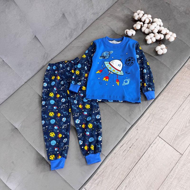 💕Пижама Космос. Ткань интерлок, тянется, хорошего качества. Малюнок - принт, накат. Есть манжеты на рукавах и штанишках. Ткань Турция. Выработка Украина. 📐Замеры: (104-110) - кофт. длж.39 / полуобхв.31 / рукав.35 / брюки длиннее. 57 / крок 35