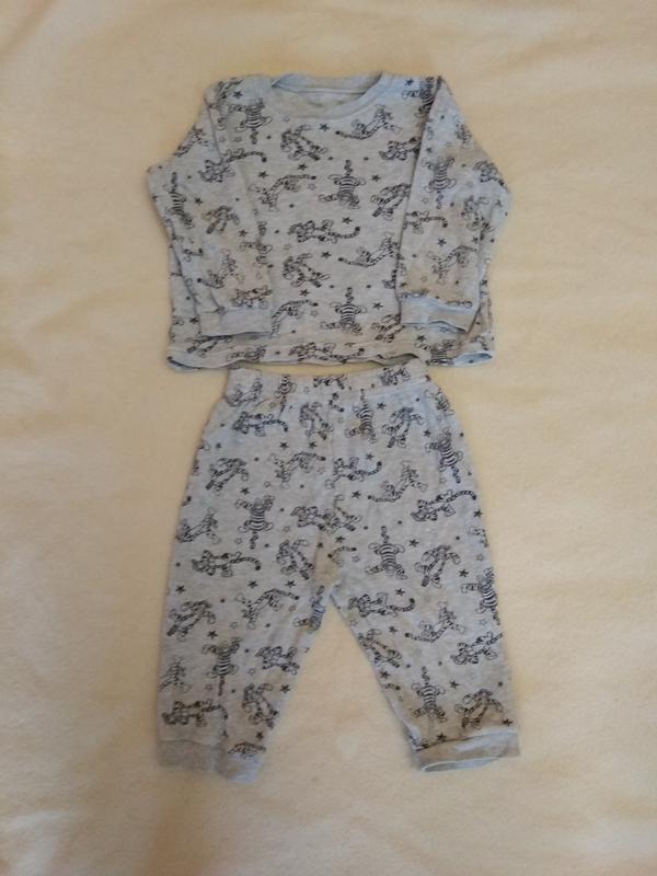 Хлопковая пижама на возраст от 9 месяцев до 2 лет. Замеры: штанишки - длина 37, шаговый 21, пояс на резинке 20; кофточка - длина 28, ширина 31, рукав 25, плечи 22.