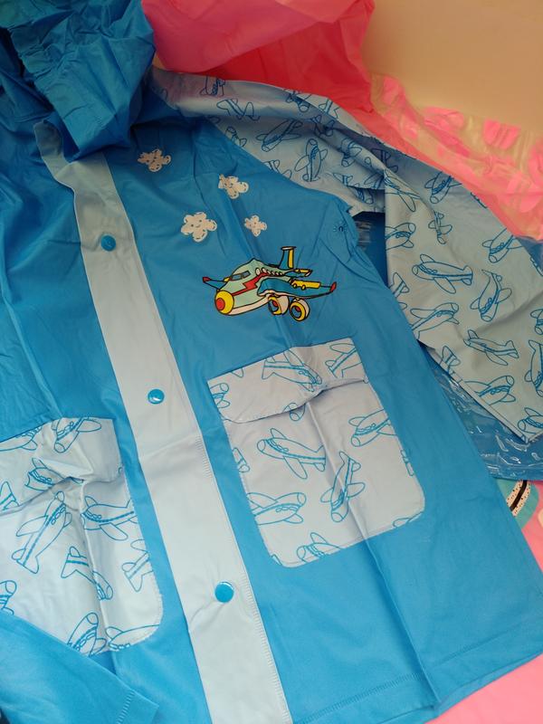 детские плащи-дождевики. Тоненькие и легкие. В капюшене мягкая резиночка для лучшего прилегания. Застегиваются на кнопочки.впереди по два кармашка. Материал ПВХ. Размеры Xs, s,m. Пр. Китай
