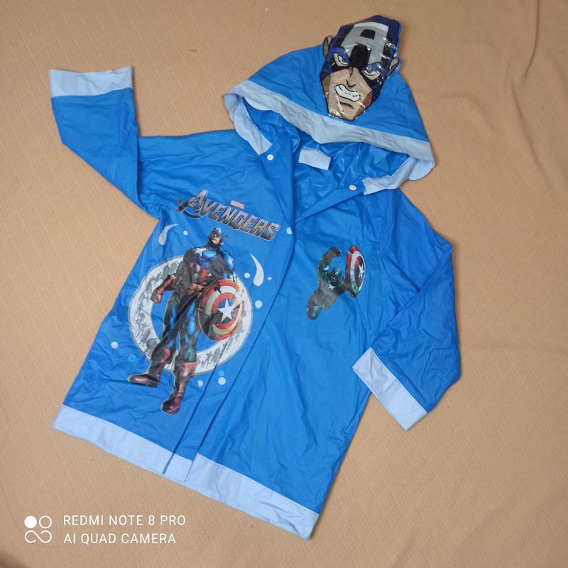 Дитячий дощовик "Капітан Америка"розмір вказаний M. Довжина 60 см, ширина 45 см, довжина рукава від горловини 52 див. Дощовик застібається на 4 кнопки.Обідок на капюшоні надувається.Стан відмінний.