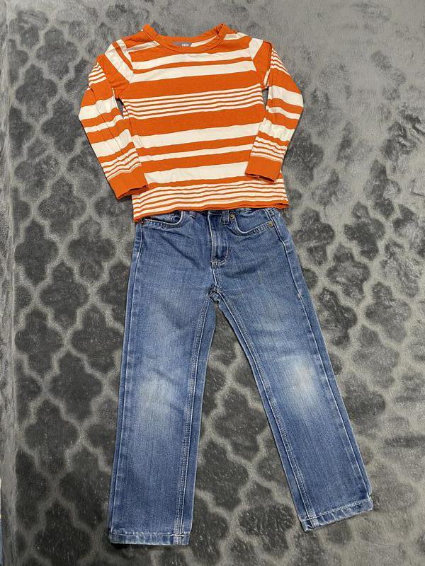 Кофта в біло-помаранчеву смужку Комір круглий Рукави довгі на них манжети Тягуча,щільність середня Довжина 41,5 см) Плечі 26 см) Пог 32,5 см) Піт 31 см) Знизу 31,5 см) Рукав 36,5 см) Джинси Застібаються на замок блискавку і залізну застібку На талії резинка для регулювання розміру Є гачки для ременя Є дві кишені спереду і два ззаду класичний Фасон Щільні не тягучі Довжина 60 см) Пот 24 см) Поб 33,5 см) Напівобхват знизу однією штаныны 13 см) Кроковий 42 см) Висота посадки 18,7 см) Підійде на 2-5 років орієнтуйтеся по замірах 👆🏻