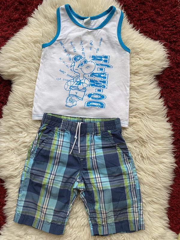 Костюм подобранный, можно носить отдельно/ Фото на теле нет Маечка с бретелями средней ширины Фасон свободный Впереди рисунок Плотность средняя Тянется На шортах на талии резинка средней ширины у нее шнурок стягивается до нужного размера свободный Фасон Не тянется средняя Плотность карманы Подойдет на 5-7 лет) Из нюансов-застеганные шорты на фото указано, в цене учтены, Продается без возврата.