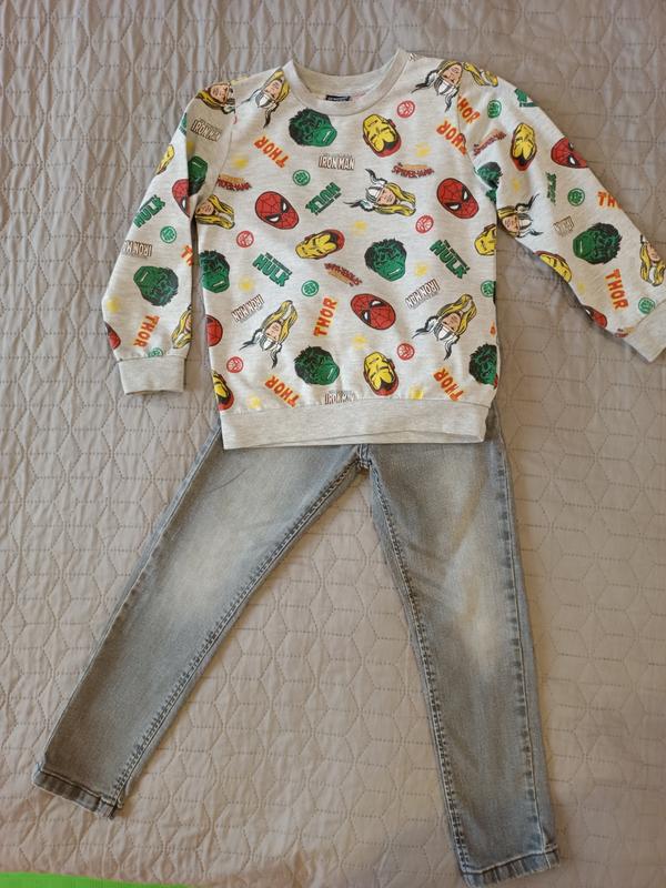 джинси длина 68см шаговой 51см пояс с утяжкой 22см на фото ширина штанины снизу 11см свитшот супергерои: длина 46см рукав 40см пог 37см ширина по низу 32см кофта левис идет в подарок ціна вказана за набір