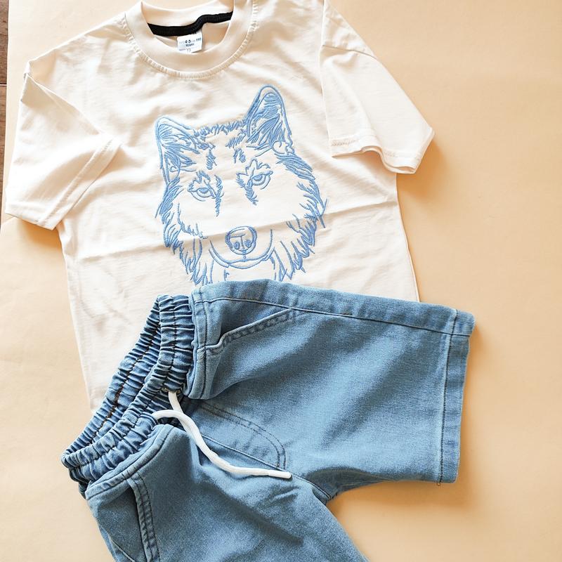Крутий літній костюм для хлопчика. Футболка та шорти з тонкого деніму Виробник Туреччина Розмір 5-6, 9-10