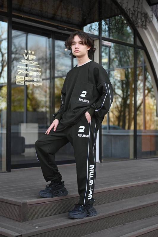 Трендовый подростковый костюм ‼️No2449!!️ Ткань - турецкая двунить не линяє, не скатывается, премиум качества. Стильный свитшот с перестрочками. Рукава и штаны отделаны кантами. Штани джогери. Размеры: 146-152,152-158,158-164,164-170 Цвет-черный, хаки Принт - шелкография