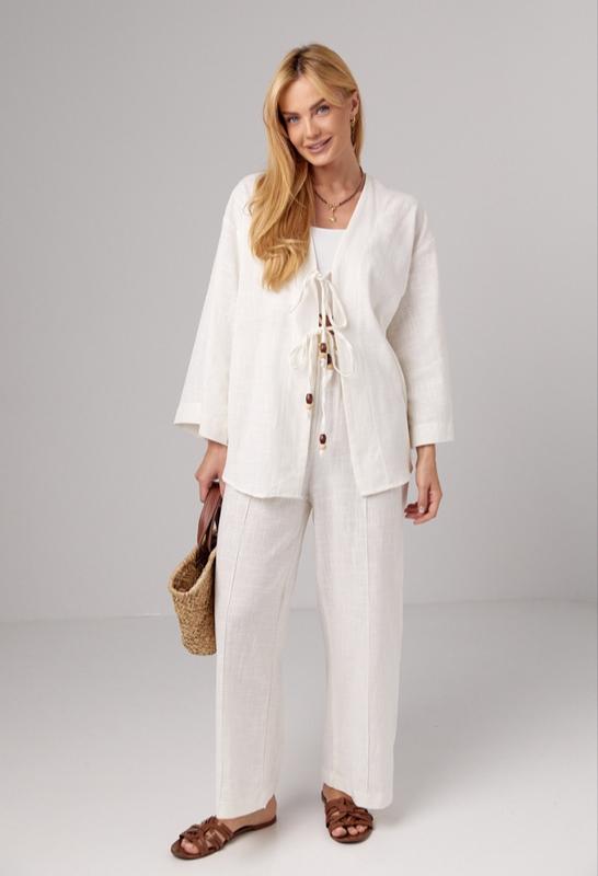 Льняной костюм с прямыми брюками и рубашкой на завязках