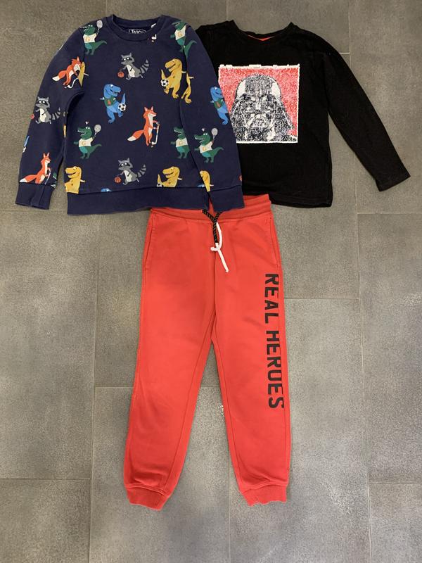 Всі речі з мого сина у чудовому стані. Штани колір темніший (камера не передає) Штани довжина 70 см, пояс 27/31, крок 51 см Синій світшот: довжина 48 см, 37 см,рукав від шиї 53 см Чорний реглан з паєтками:довжина 44 см, ширина 34 см, рукав від шиї 49 см Не секонд!!