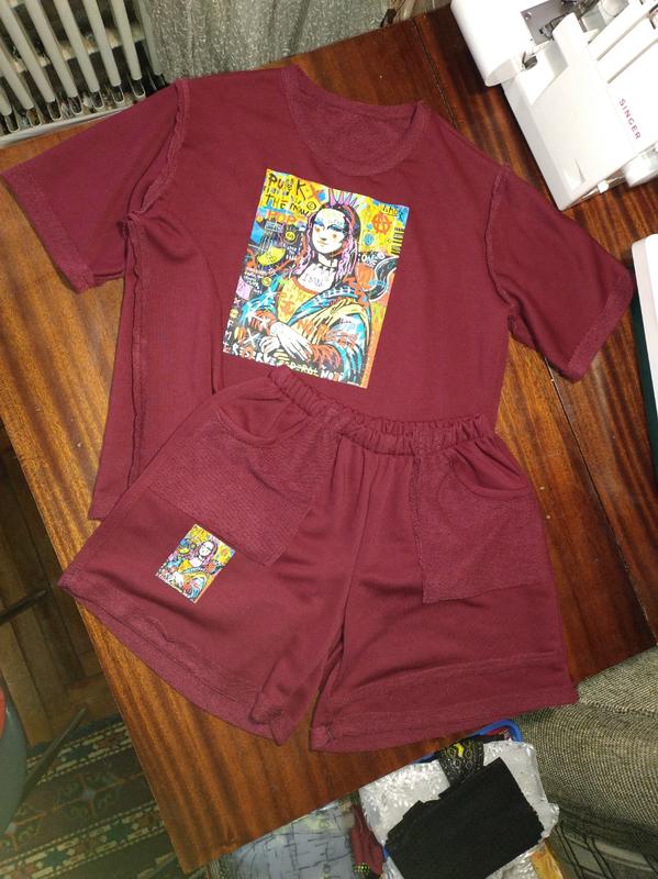 Выполненный из трехнитки-петли, качества пеет, хлопок 95%, 5% эластан, не кашлатится! Цвет насыщен вишневый. Очень необычная модель- швами наружу, термопалипка Мона Лиза в стиле гранж. Для тех, кто хочет выделиться среди серого толпы🫶👌 Замеры: футба длина 60, пог/поб 54 шорты длина 40, поб 54 Подойдет в качестве оверсайза на С-М, рост от 152 до 164.