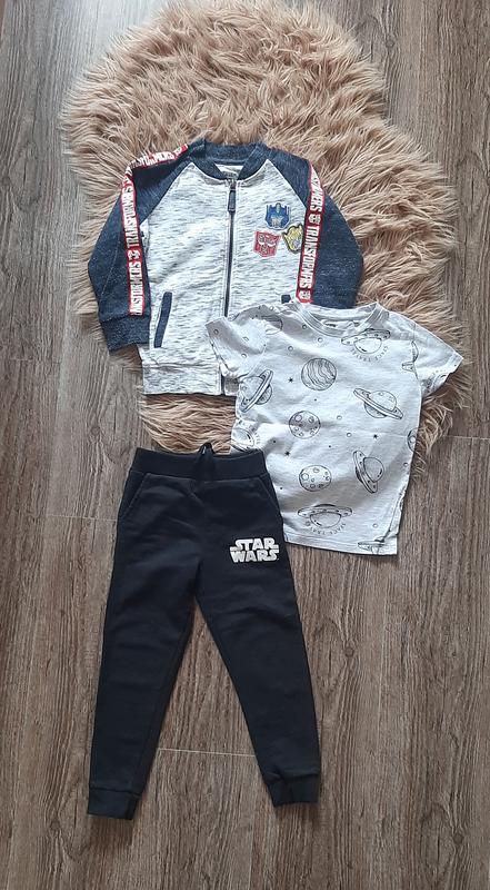 комплект состоит из брюк+ кофточка на замочке ( ззади внизу есть едва заметное пятнышко- на фото не передается)+ футболочка