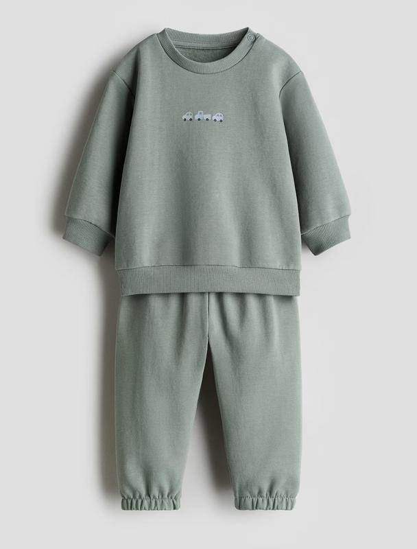 Комплект із трикотажної дресової тканини з м’яким начосом усередині, що складається зі світшота та джоггерів. Світшот має невеликий принт із мотивом спереду. Круглий виріз горловини зі стрейчевим трикотажним кантом, застібки-кнопки на одному плечі (крім розмірів 98-104). Рукави та низ виробу оздоблені еластичними манжетами. Джоггери мають еластичний пояс зі шнурком для регулювання та еластичні манжети на щиколотках В наявності: 86, 92