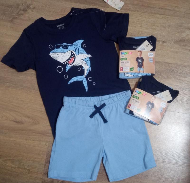 очень классные летние костюмчики на мальчика от брендового производителя lupilu состоят из футболочки и шортиков.Шортики идут на завязках можно регулировать талию. состав 100% хлопков приятны на ощупь не теряют цвета пристежки не растягивается качество суперовое👍👍👍💥 Костюм идет в упаковке, возможна презентовать на подарок ц🎁🎁🎁 Размер 110/116 на 4-6роков(3) длина футболочки 45 см длина шортиков 29 см талия по резиночке 28 см.