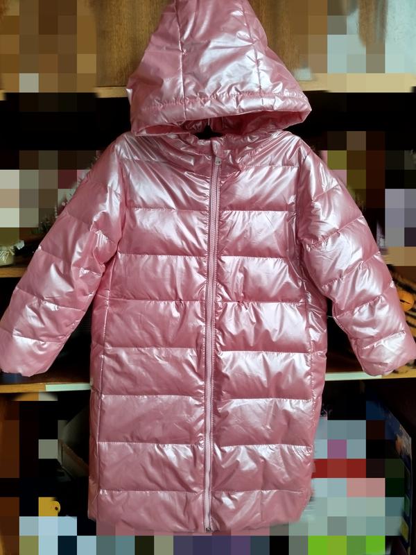 Это новое розовое блестящее зимнее пальто-пуховик с капюшоном(100%полиестер,70% утиный пух).Оно отличается глянцевым металлическим блеском и стеганым дизайном. На принцессу 6-8лет(126-132см).В идеальном состоянии про супер
